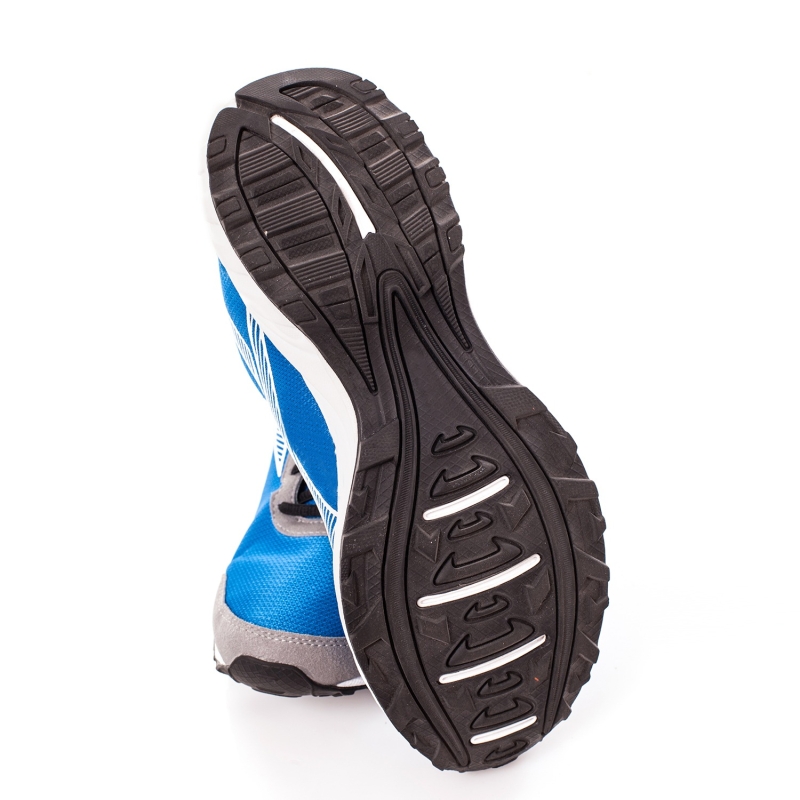 زوج من أحذية الجري الزرقاء ، مع تصميم منتظم ، تفاصيل الأربطة