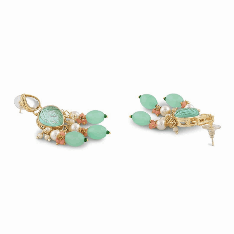 Green & Peach Stones & Beads Kundan Choker Necklace Earring & Ring Set