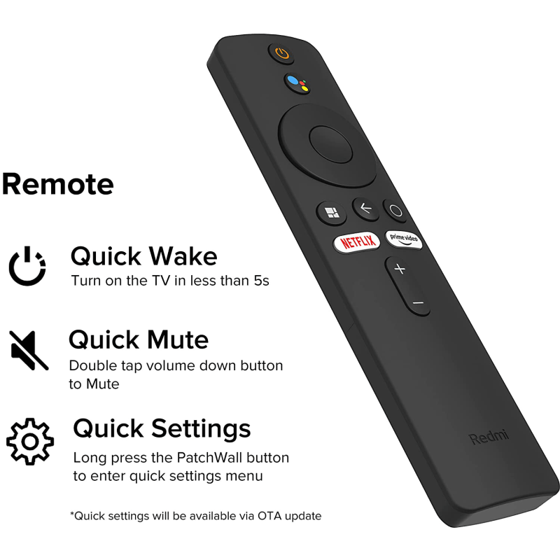 Smart TV Features : Android TV 11 | Chromecast built-in | PatchWall 4 with IMDb integration | Kids Mode with Parental Lock | 75+ Free Live Channels | Universal search | Language Universe (16+ Languages) | India's Top 10 | Miracast | Supported Apps: Prime Video | Netflix | Disney + Hotstar | YouTube | Apple TV | 5000+ apps from Play Store | Auto Low Latency Mode | Quad core processor | Dual band Wi-Fi | 1GB RAM + 8GB Storage